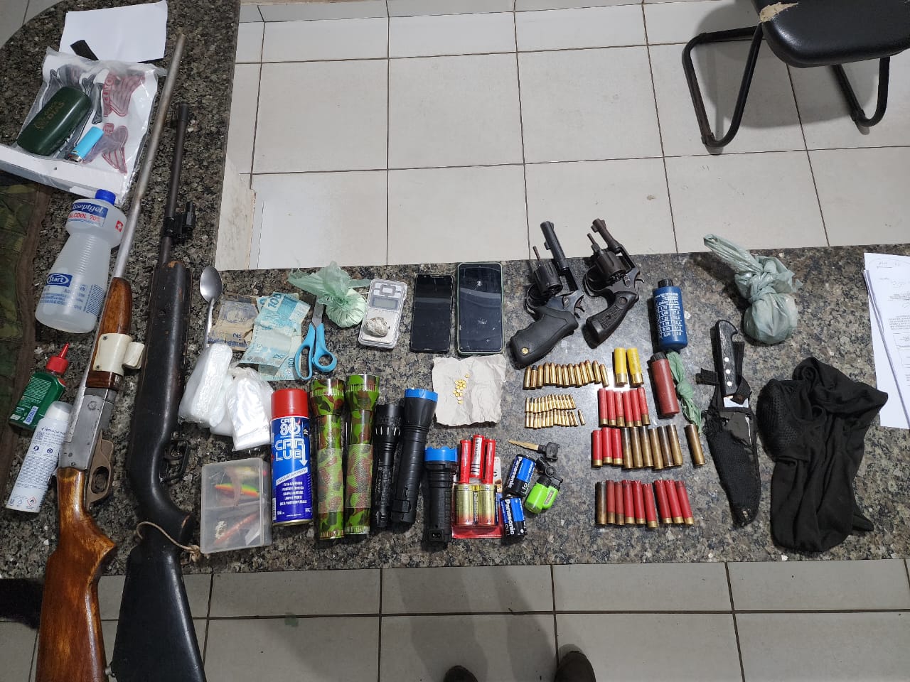 Ao efetuar a prisão, e de posse do devido Mandado Judicial, a Polícia Militar encontrou com o acusado várias armas de fogo de variados calires, munições intactas, cartuchos, substâncias análogas à maconha e cocaína, pólvora, uma balança de precisão, uma lanterna e uma moto sem placa, com chassi adulterado.