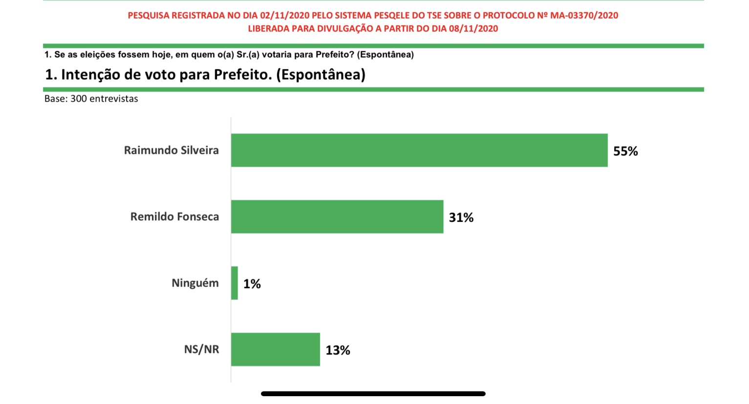 No levantamento da espontânea, aquela em que o pesquisador não revela o nome dos pré-candidatos e apenas pergunta para quem o eleitor votará para prefeito, Raimundinho tem 55% da preferência do eleitorado de Parnarama contra 31% do seu opositor.